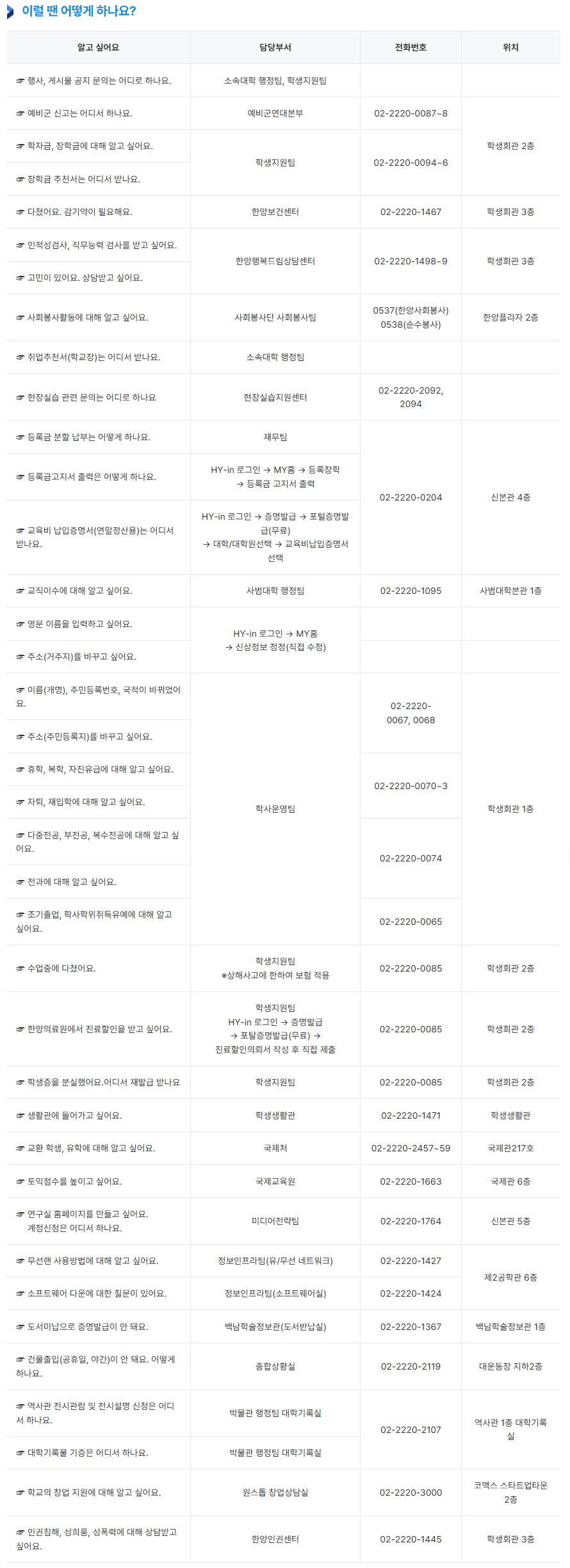 [한양대학교] 업무별 담당 부서 안내