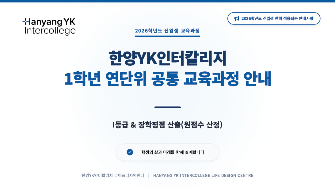 한양YK인터칼리지 1학년 연단위 공통 교육과정 운영 방식과 I(Incomplete) 등급 제도에 대한 이해를 돕기 위해 안내자료를 첨부하였습니다. 해당 자료를 통해 연단위 교과목의 성적 부여 방식과 I등급의 의미를 확인하실 수 있습니다.