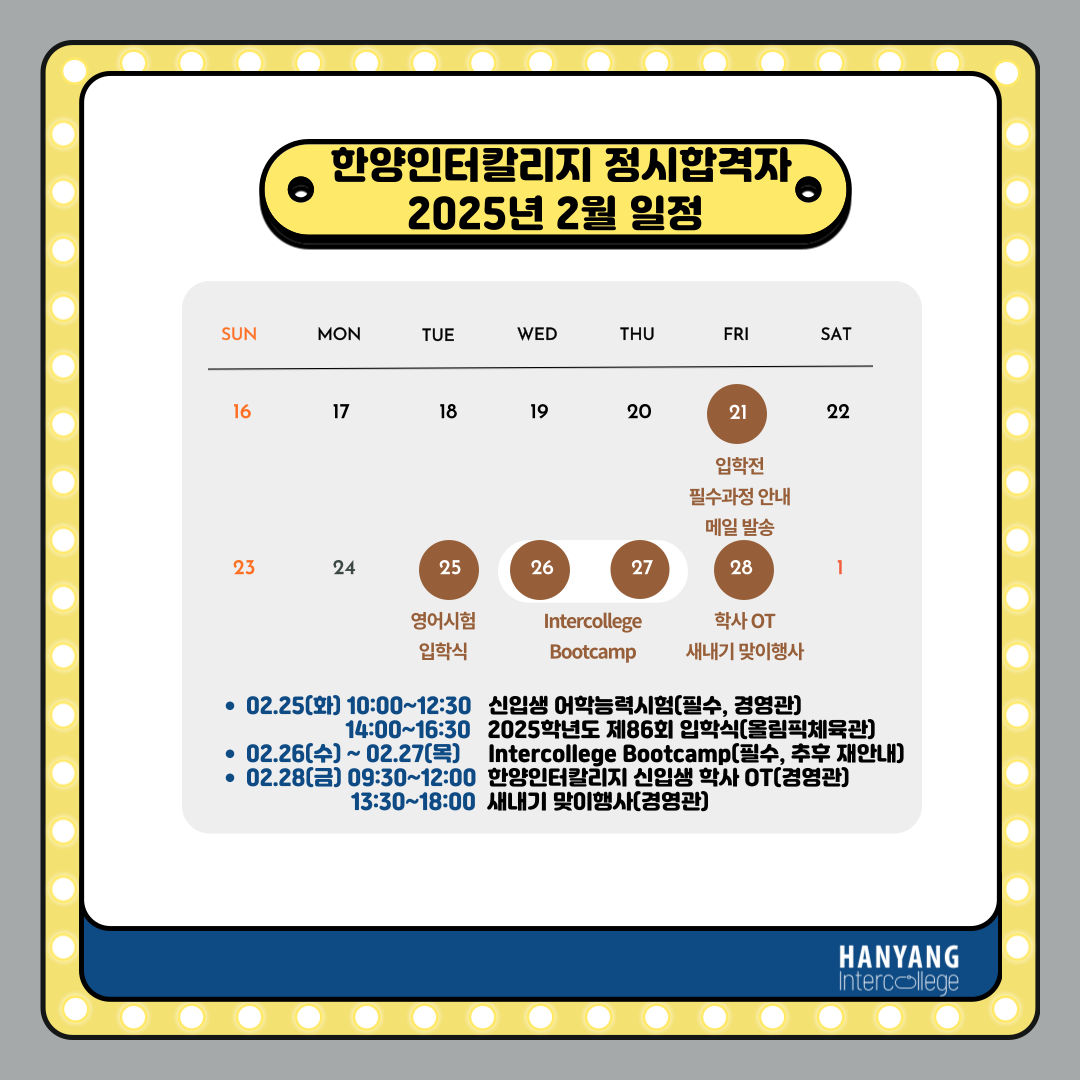 2025학년도 한양인터칼리지 정시합격자 2025년 2월 일정 안내